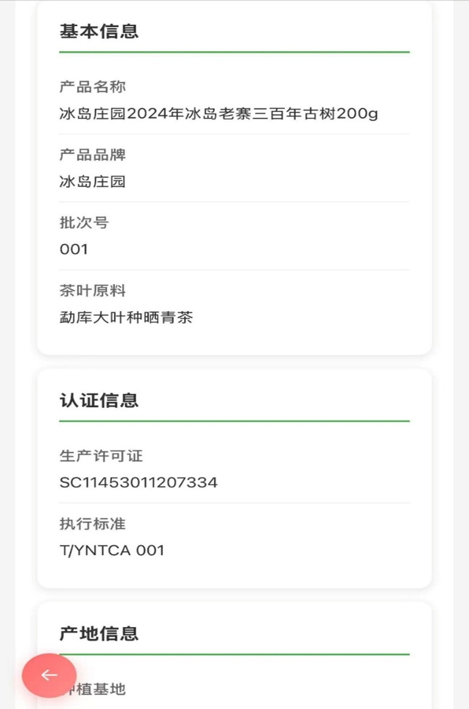 在完成防伪查询功能后,用户可以点击“产品溯源”了解产品批次、产地信息、认证信息等更多溯源信息。以国内某个知名茶叶品牌的应用为例,其效果图如下: